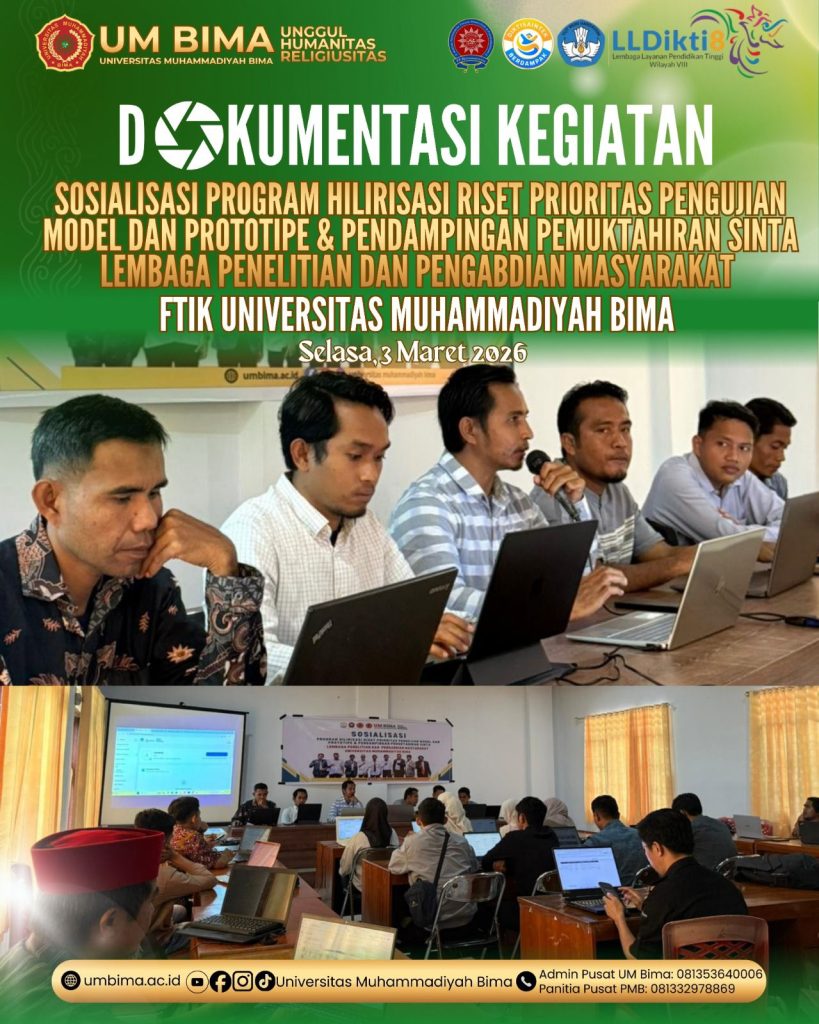 Kegiatan Sosialisasi Program Hilirisasi Riset Prioritas Pengujian Model dan Prototipe serta Pendampingan Pemutakhiran SINTA yang diselenggarakan oleh Lembaga Penelitian dan Pengabdian kepada Masyarakat (LPPM) Universitas Muhammadiyah Bima menjadi langkah strategis dalam memperkuat budaya riset yang berdampak nyata. Program ini dirancang untuk mendorong dosen dan peneliti agar tidak berhenti pada publikasi ilmiah semata, tetapi mampu mengarahkan hasil riset menuju tahap hilirisasi, pengujian model, hingga pengembangan prototipe yang aplikatif. Dengan demikian, penelitian tidak hanya berkontribusi pada pengembangan ilmu pengetahuan, tetapi juga menjawab kebutuhan masyarakat dan dunia usaha secara konkret.